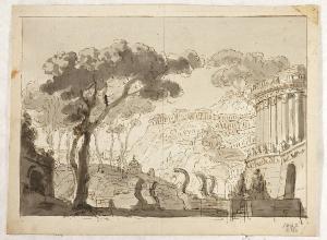 - NOTIZIE STORICO CRITICHE La raffigurazione della città arroccata sulla montagna nella quale compaiono numerosi tempi e la foggia degli edifici in primo piano lasciano pensare che il disegno si riferisca ad una composizione ambientata nel mondo classico antico. Potrebbe trattarsi del ballo "Oreste (o La morte di Egisto)" dell'Otello di Rossini che si svolse al Teatro Regio di Torino nella stagione 1825-26.