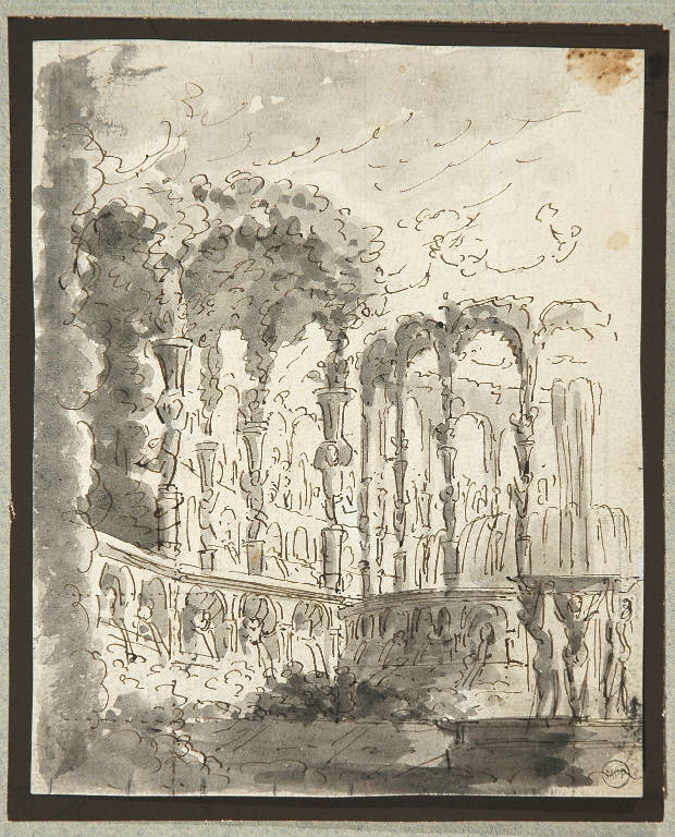- NOTIZIE STORICO CRITICHE Il disegno appare schizzato molto rapidamente e rivela alcune analogie con le opere realizzate dai Galliari. Dovrebbe pertanto essere riferibile al primo decennio dell'800, periodo del quale si dispone peraltro di scarsissimo materiale relativo alla produzione di Vacca.