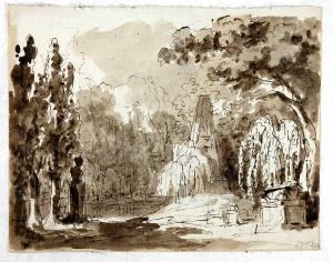 Scena raffigurante un bosco con monumenti funebri/ Schizzo per scena raffigurante un giardino con grande edificio sul fondo. PAESAGGIO CON ARCHITETTURE