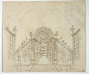 - NOTIZIE STORICO CRITICHE Il disegno appare schizzato molto rapidamente e rivela alcune analogie con le opere realizzate dai Galliari. Dovrebbe pertanto essere riferibile al primo decennio dell'800, periodo del quale si dispone peraltro di scarsissimo materiale relativo alla produzione di Vacca.