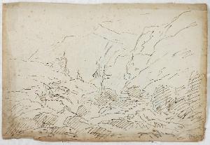 Schizzo per scena raffigurante un paesaggio montuoso/ Schizzo per donna con bambino e arto. PAESAGGIO MONTANO/ FIGURA FEMMINILE DISTESA CON BAMBINO
