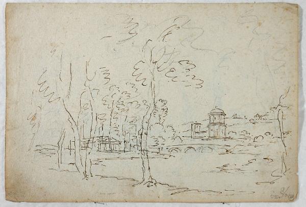 Scena raffigurante un paesaggio con ponte e templi. PAESAGGIO