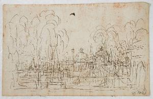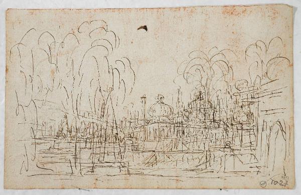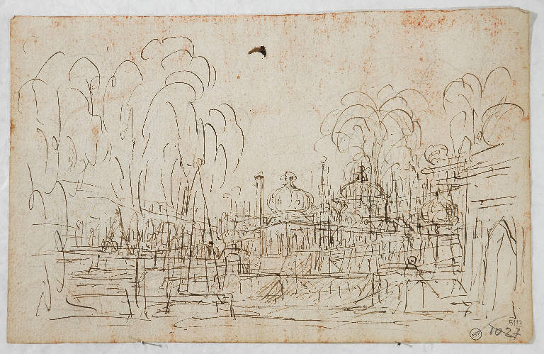 - NOTIZIE STORICO CRITICHE Il disegno appare schizzato molto rapidamente e rivela alcune analogie con le opere realizzate dai Galliari. Dovrebbe pertanto essere riferibile al primo decennio dell'800, periodo del quale si dispone peraltro di scarsissimo materiale relativo alla produzione di Vacca. Per il tratto utilizzato potrebbe anche trattarsi di semplici schizzi appena accenati, non utilizzati per successive elaborazioni teatrali e quindi appartenere ad un'epoca non meglio precisabile. Al verso è presente uno schizzo a matita con edifici appena accennati.