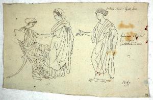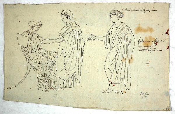 - NOTIZIE STORICO CRITICHE Il disegno è forse da ascrivere al capostipite della famiglia Morgari, Giuseppe, attivo a Torino nella prima metà dell'800, il quale si dedicò soprattutto alla raffigurazione di animali, come pure a nature morte, fiori e paesaggi, nominato per la sua abilità di prospettico e decoratore, scenografo di corte dal sovrano Carlo Felice, carica in seguito mantenuta con il re Carlo Alberto; fu quindi direttore della Reale Fabbrica di Arazzi del Castello Valentino di Torino. La sua formazione avvenne presso il Pecheux dal quale Giuseppe acquisì le innovazioni introdotte a Roma dal diffondersi della cultura neoclassica, come sembrerebbe evidenziare questo studio realizzato probabilmente per la decorazione di un vaso o riproducente l'ornamentazione di un vaso greco, secondo quanto rivelano le indicazioni fornite dall'autore stesso di fianco alle figure femminili panneggiate, di cui una seduta su un tipico sedile greco. Esse rivelano comunque strette analogie con la decorazione vascolare, come sembra attestare le note apposte a fianco delle immagini, di cui esistevano dei veri e propri repertori ai quali poter attingere: i primi e più famosi erano le due edizioni, la prima del 1767-76 di P. F. Hugues, Barone d'Hancarville, delle "Antiquitès Etrusques, Grecques et Romaines, tirées du Cabinet de M. William Hamilton, Envoyé extraordinaire et plénipotentiaire de S.M. Britannique en Cour de Naples", la seconda curata dal pittore tedesco W. Tischbein nel 1789-90. Come è stato recentemente sottolineato "La pubblicazione di questi volumi in folio, correlati di tavole colorate in rosso e nero (in pochissimi casi sono stati curati altri colori) ebbe un'influenza incalcolabile sulla produzione artistica degli ultimi decenni del Settecento. Un nuovo modello dell'antichità classica, radicalmente differente da quello della scultura, entrò con essi a far parte del patrimonio visivo dell'artista neoclassico: è la pittura vascolare greca fatta di pochissimi colori, superfici piatte, nessun senso della profondità e un uso modernissimo della linea come unico mezzo espressivo" con una "marcata tendenza all'astrazione lineare, all'uso del disegno a semplice contorno" (Neoclassicismo in Italia, p. 416), che appare evidente anche nelle figure del disegno qui esaminato. Alcune analogie possono essere riscontrate con le decorazioni dei vasi del cosiddetto gabinetto etrusco realizzato da Pelagio Palagi per il Castello di Racconigi nel 1834.