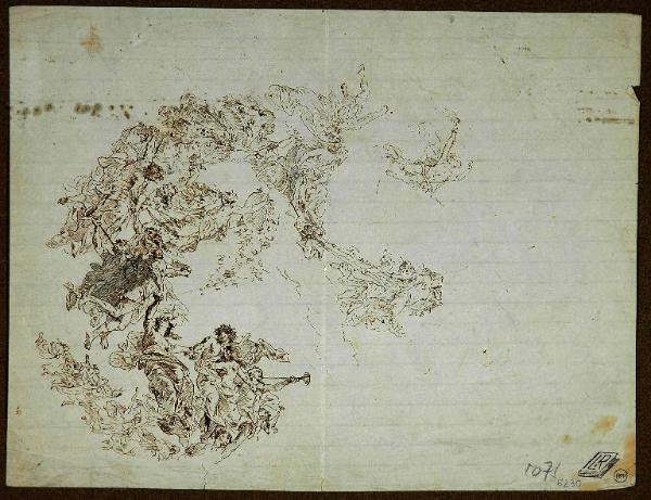 - NOTIZIE STORICO CRITICHE Il soggetto potrebbe essere interpretabile come il carro di Aurora trainato da putti e circondato dal corteo delle ore o da ninfe ed essere pertanto accostabile nel tema al bozzetto eseguito nel 1843 per il sipario del teatro di Voghera raffigurante il passaggio delle ore. Si ricorda inoltre che nel 1869 Francesco Gonin realizzava il bozzetto con Venere ed il corteo delle Grazie e amorini per il Teatro Regio di Torino. Meno verosimile che possa trattarsi del carro di Apollo per le sembianze femminee del conducente, anche se in primo piano uno dei partecipanti al corteo reca la cetra. Per alcuni caratteri, quali l'aspetto delle figure femminili ed il tratto maggiormente calligrafico, il disegno potrebbe essere più tardo e, per le analogie riscontrabili con le opere realizzate da Luigi Morgari, in particolare col dipinto "Diana cacciatrice: il riposo" realizzato per l'Hotel Riviera Palace di Montecarlo (Dragone, 1991 p. 117). Luigi (1857-1935) era il primogenito di Paolo Emilio il Vecchio ed aveva compiuto i propri studi all'Accademia Albertina con Enrico Gamba e Andrea Gastaldi; si dedicò in particolare all'affresco ed alla decorazione lavorando nel Castello di Agliè, in numerosissime chiese del Piemonte, in Liguria ed anche in Lombardia (a Milano in Santa Maria Segreta e in San Gottardo, a Rho nel Santuario dell'Addolorata). A Genova eseguì importanti composizioni di soggetto mitologico a Palazzo Quartara ed a Palazzo Raggio a San Luca d'Albaro, ove realizzò "Il sole che feconda la terra", una "libera interpretazione di tiepolesca ispirazione" (Dragone 1991, p. 118), tema forse avvicinabile a quello del disegno qui esaminato.