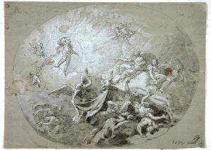 - NOTIZIE STORICO CRITICHE Il soggetto potrebbe essere interpretabile come un'allegoria, anche se la presenza del giovane guerriero e della fanciulla potrebbe far pensare pure ad un tema mitologico. La scena è racchiusa all'interno di un ovale: questo indicherebbe che si tratta di uno studio preparatorio in relazione ad una decorazione, come pare attestare la discreta finitezza del disegno e la curatezza nella resa chiaroscurale evidenziato anche dall'uso della biacca, con il contrasto tra la parte superiore in piena luce e quella inferiore densa di ombre. A tale proposito la critica recente ha evidenziato come la formazione giovanile di Paolo Emilio, di impostazione neoclassica e derivata dal padre Giuseppe attraverso il Pecheux, si evolva negli anni Quaranta ed "anticipa quell'effetto di trapasso dalla lumonosità al buio, artificio che riprenderà in alcune opere monumentali più tarde (cupola della basilica del Santi Maurizio e Lazzaro a Torino)" (Ottocento Italiano, 1991, p. 930), che era stato acquisito attraverso gli studi ed assimilato grazie anche alla predilizione giovanile per i modi raffaelleschi e correggeschi. Negli anni Cinquanta seguono infatti le grandi decorazioni murali commissionate dalla Pubblica Amministrazione e per casa reale, oltre agli incarichi per ornare ed abbellire le chiese cittadine, impostate in ampie composizioni ricche di figure e movimento, e con una calibrata resa luministica.
