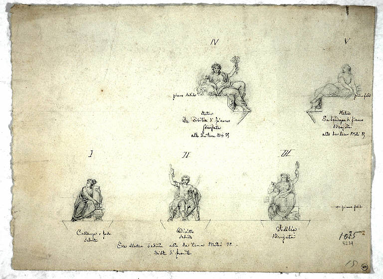 - NOTIZIE STORICO CRITICHE Per i soggetti raffigurati (statue con personificazioni delle aree regionali della penisola italiana insieme a quelle del Diritto e della Costanza/Fede) potrebbe trattarsi di bozzetti per una prima idea della decorazione della Sala del Nuovo Parlamento Subalpino di Torino in Palazzo Carignano (il cui soffitto veniva ornato da Francesco Gonin con le Arti e le Scienze), sostituita poi dalla raffigurazione a monocromo delle Scienze, oppure potrebbero essere in relazione con le figure allegoriche dell'atrio municipale di Torino (la Legge, la Diplomazia, la Guerra e l'Industria), citati entrambi dalle fonti. Stando alle scritte apposte vicino alle figure delle regioni, quasi tutte sedute, dovevano comparire accanto le personificazioni delle città più importanti, le quali, sempre facendo riferimento alle scritte autografe presenti sul foglio, dovevano essere disposte di fronte o di fianco (es. "Statua Piemonte, di fronte Torino", "Lombardia di fianco, Milano"). Le statue erano inoltre collocate secondo un preciso ordine, indicato da lettere (da A a N) o da numeri romani (I-V); veniva precisato che esse dovevano essere poste "Tutte all'altezza da terra di Metri 21.00" e veniva segnalata l'avvertenza che "la direzione delle frecce indica la parte che debbono guardare le statue di profilo". Il riferimento cronologico più adeguato dovrebbe essere circoscrivibile agli anni compresi tra il 1860-70, all'epoca in cui si realizzano i suddetti lavori di abbellimento dei menzionati palazzi. In particolare riguardo all'aula ad anfiteatro allestita nel 1848 per il Nuovo Parlamento di Palazzo Carignano, posta nell'antica sala circolare realizzata da Guarino Guarini (1679) su incarico del principe Emanuele Filiberto di Savoia Carignano, si segnala che la decorazione ad affresco fu eseguita da F. Gonin (1808-1889) insieme ad Angelo Capisani, Angelo Moja e Grazioso Rusca ed andò a sostituire la precedente progettata da Filippo Nicolis di Robilant (con la collaborazione di Leonardo Marini e dei fratelli Galliari per la volta). Essa accolse il 10 maggio 1848 i 204 rappresentanti del Regno Sardo e quindi i 387 membri del parlamento del Regno d'Italia. Riguardo ai disegni in esame sembra da escludere che essi possano essere messi in relazione con le otto figure stanti realizzate da Rodolfo Morgari (1827-1909), fratello di Paolo Emilio il Vecchio e nominato dal re nel 1858 "pittore e reaturatore dei Regi Palazzi", pur con analogie nell'impostazione del soggetto, per la facciata di Palazzo Ferrero d'Ormea, già Guarene, edificato su disegno dell'architetto Amedeo di Castellamonte (1613-1683), che andarono a sostituire quelle settecentesche create da Sebastiano Galeotti dopo i lavori ottocenteschi di ristrutturazione operati da Giuseppe Maria Talucchi.