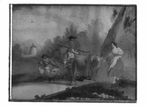 Pastori con gregge presso un laghetto