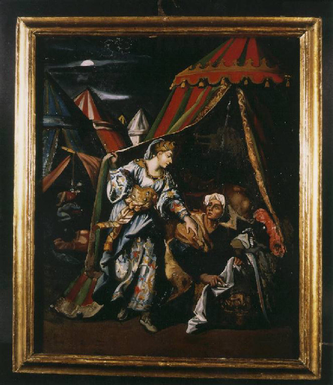 Giuditta e la sua ancella mettono la testa di Oloferne in una cesta e la coprono con un panno