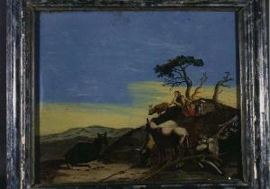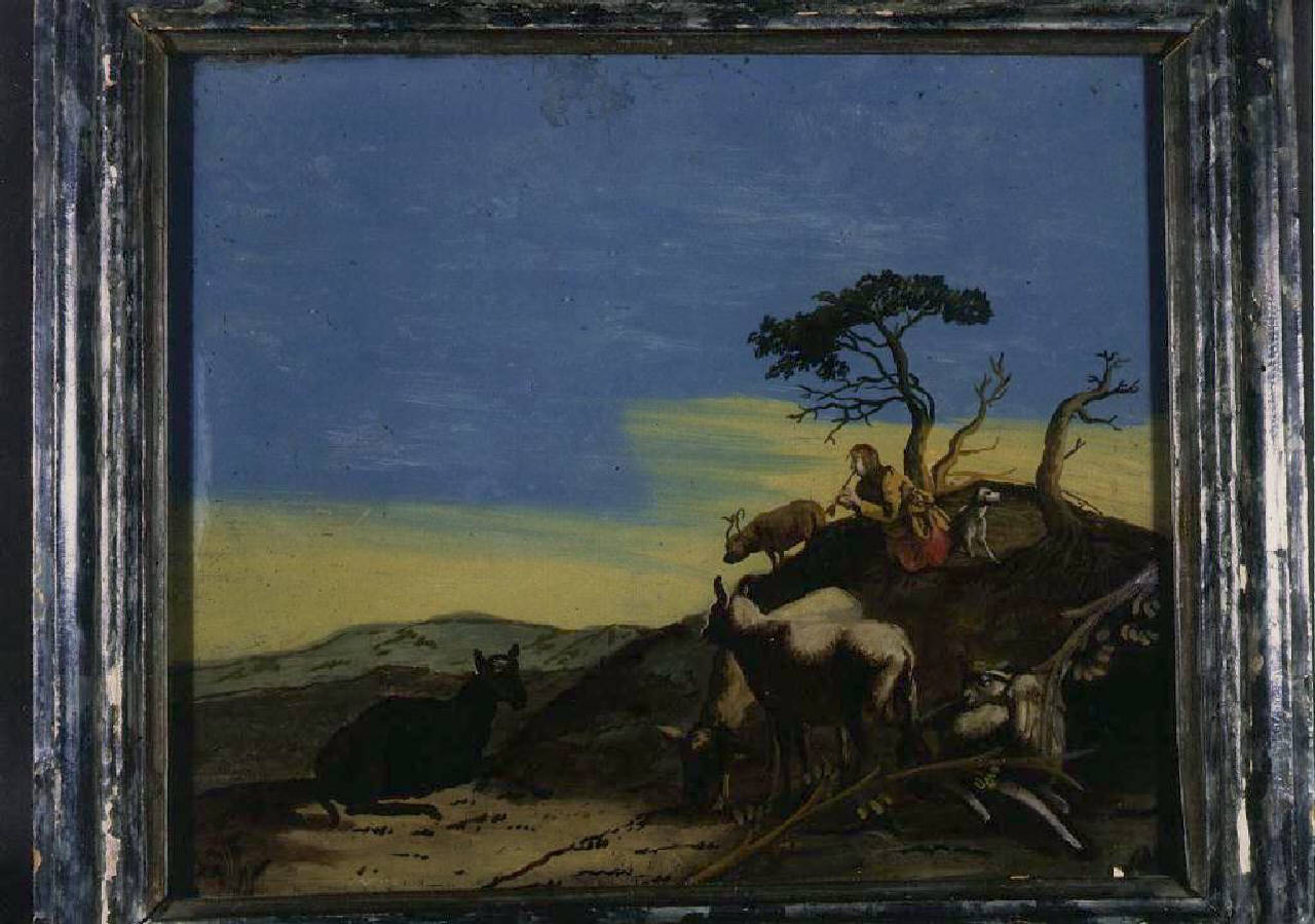 paesaggio con pastore che suona il flauto e animali