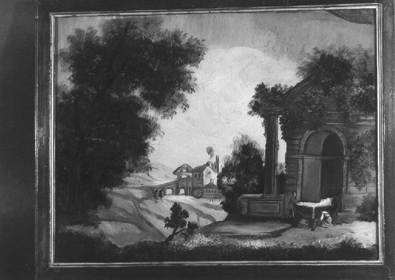 paesaggio con fontana e figure