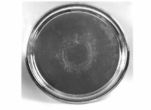 Corpo circolare con tre piedini a riccioli e attaccatura squadrata; incisione con decorazione a rocaille al centro