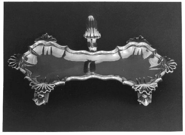 Corpo allungato e profilo sagomato con quattro conchiglie, presa terminante a foglia; poggia su quattro piedini palmati