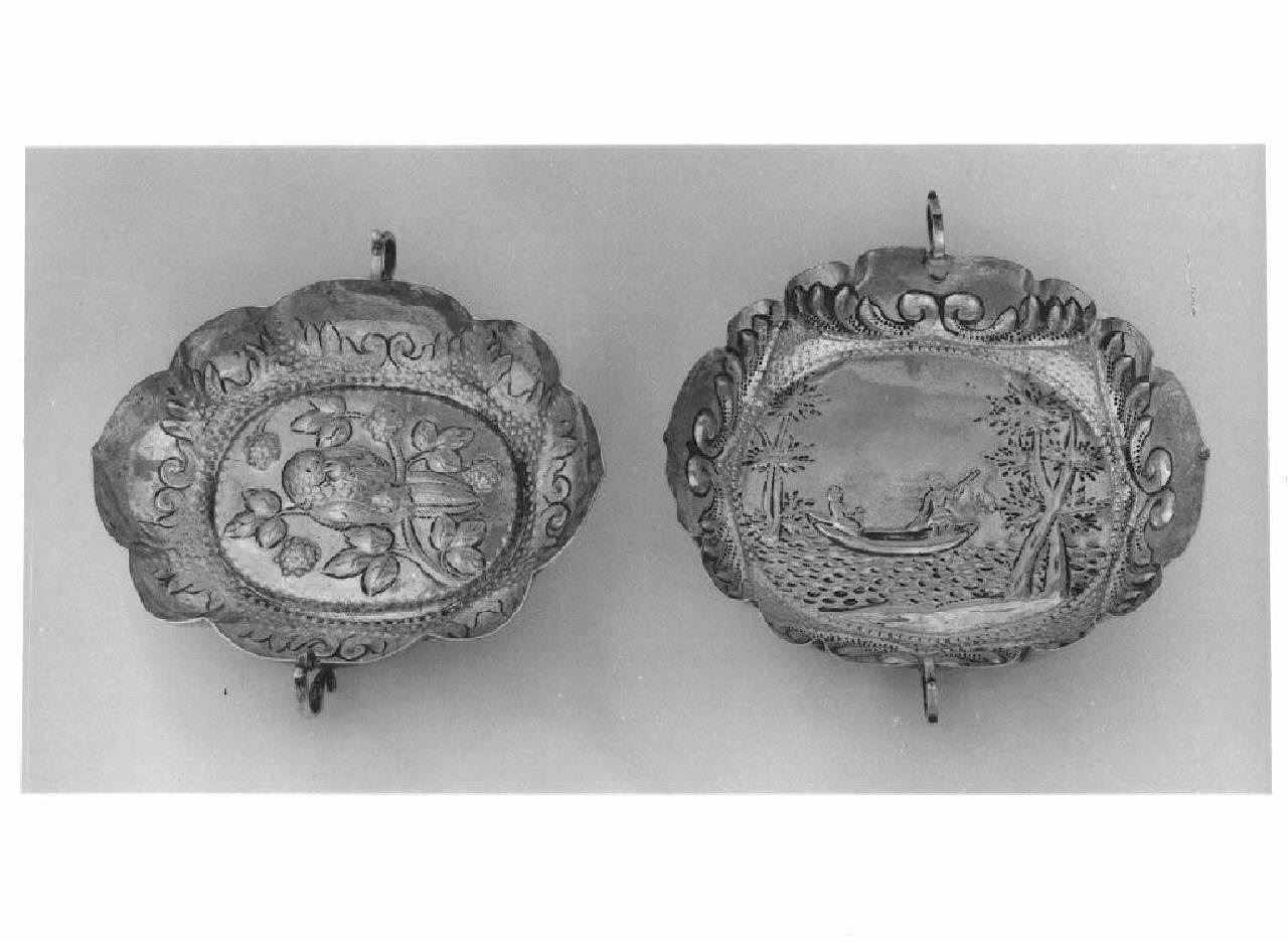 Corpo ovale sagomato, decorazione centrale a sbalzo raffigurante un pappagallo tra rami di vite, sul bordo decori a motivi vegetali, due manici laterali