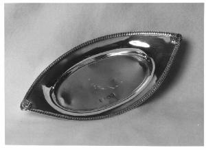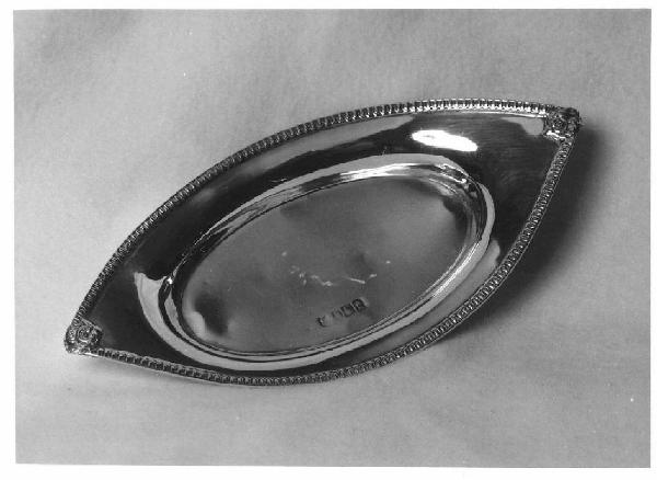 Corpo ovale liscio con bordo rialzato profilato a ovuli e con due rosette alle estremità, quattro piedini a sfera schiacciata