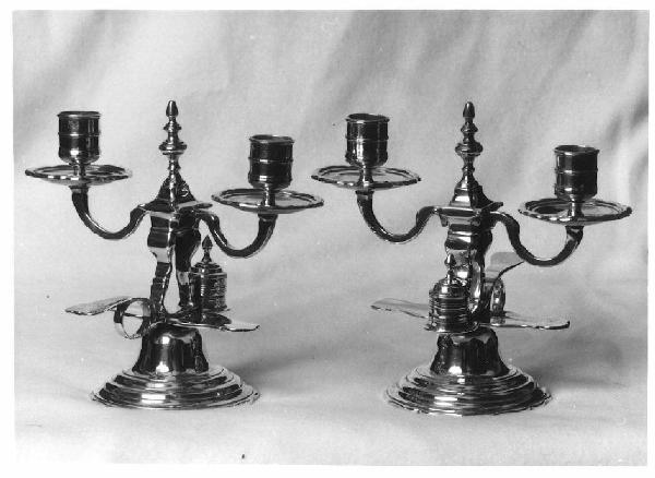 Candeliere a due bracci, base circolare sagomata e gradinata, reggicandela cilindrici su piattini sagomati, spegnimoccolo indipendente, presa sul retro liscia con stemma, presa superiore terminante a ghianda