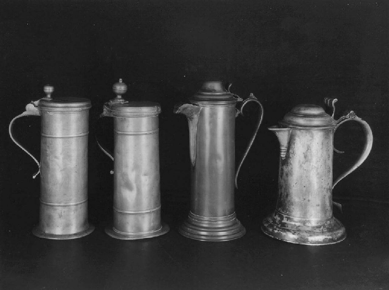 Corpo cilindrico liscio, manico laterale con attaccatura a foglia e decorazione a ricciolo, coperchio gradinato, incernierato sul corpo, beccuccio, base circolare gradinata