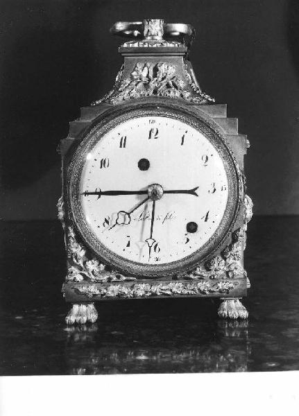 Corpo cubico con sommità troncopiramidale gradinata con maniglia formata da due serpenti, quadrante circolare in smalto bianco con numeri arabi, quattro supporti a zampa ferina; retro decorato a traforo. Suoneria ore e quarti a passaggio e richiemo e svegliarino