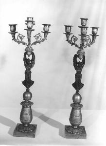 Base quadrata, piedestallo a balaustro con scanalatura centrale e con base circolare a foglie; terminante in una sfera liscia su cui poggia una vittoria alata in bronzo che regge sopra la testa i quattro bracci del candelabro decorati a volute, fogliami e con quattro reggicandela cilindrici scanalati