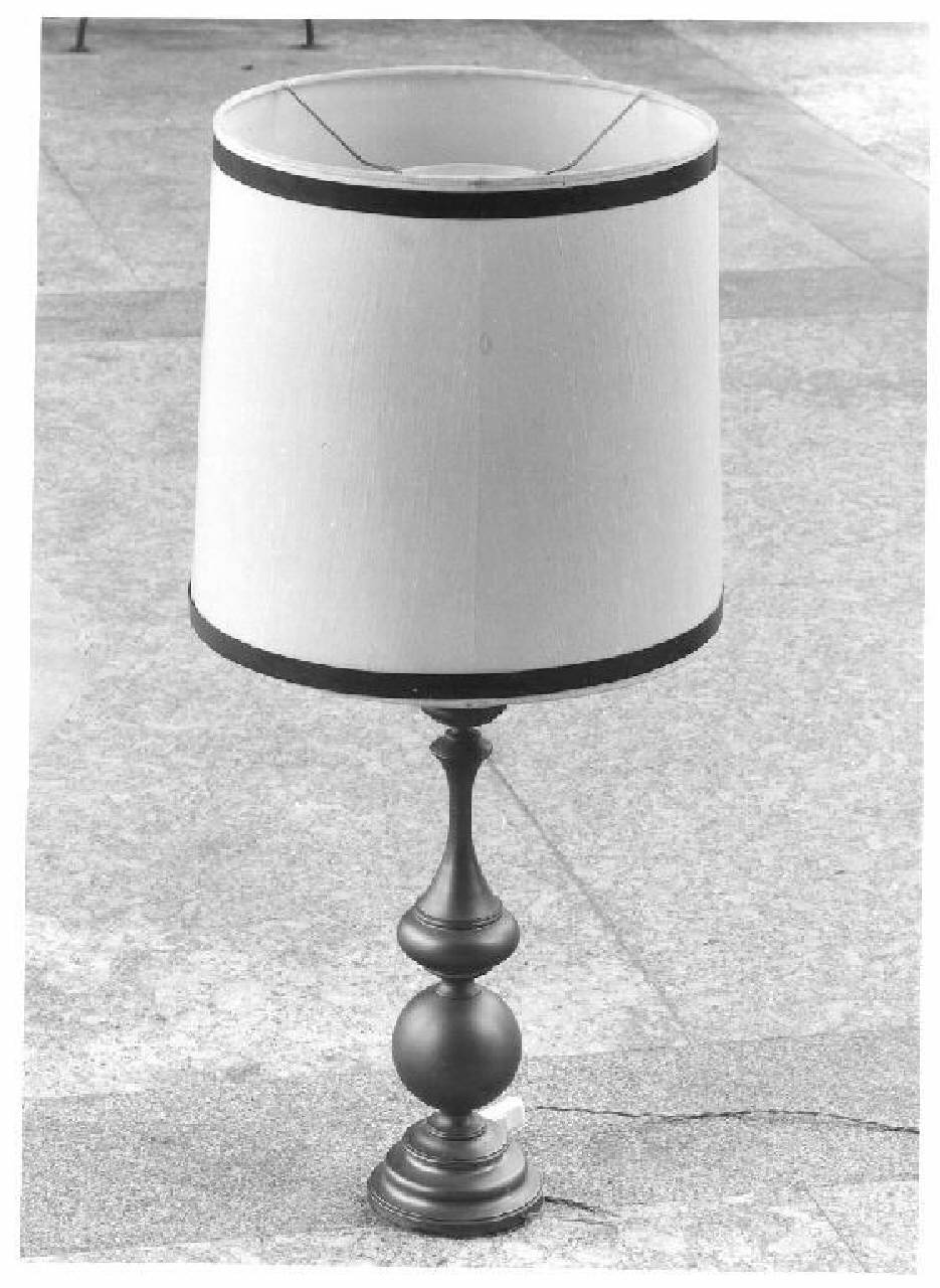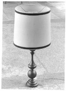 Fusto in ottone a balaustro, paralume cilindrico in stoffa beige con profili in ottone