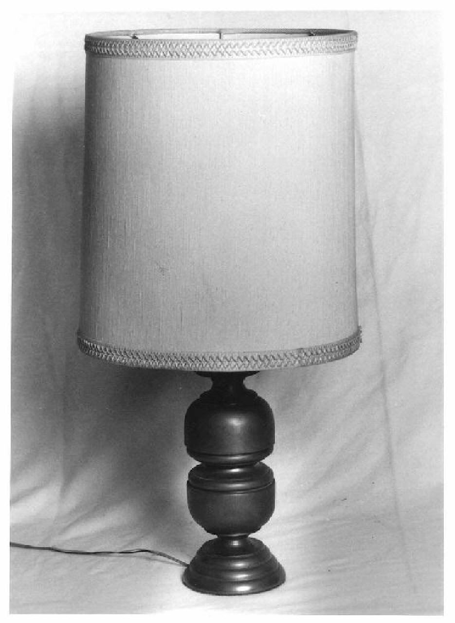 Fusto a vaso con base circolare, paralume cilindrico in stoffa beige con profili in fettuccia beige