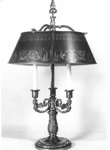 Fusto a balaustro con scanalatura e foglie d'acanto, base circolare con profilo a ovuli allungati, tre bracci a volute con cariatidi alate che sostengono i reggicandela, paralume in pelle con decori a girali vegetali, estremità superiore del fusto attraversata da freccia