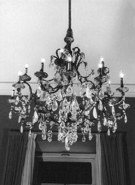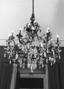 Lampadario a sei bracci a ricciolo ognuno con tre luci, corona centrale, pendenti a goccia e romboidali, piattini a profilo mistilineo