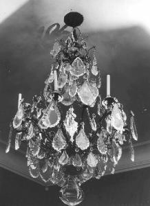 Lampadario campaniforme a dodici bracci e sei fiamme con piattino reggicandela a profilo perlinato, decorazioni applicate a rosette, pendenti a goccia lisci e sagomati