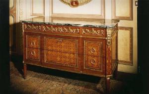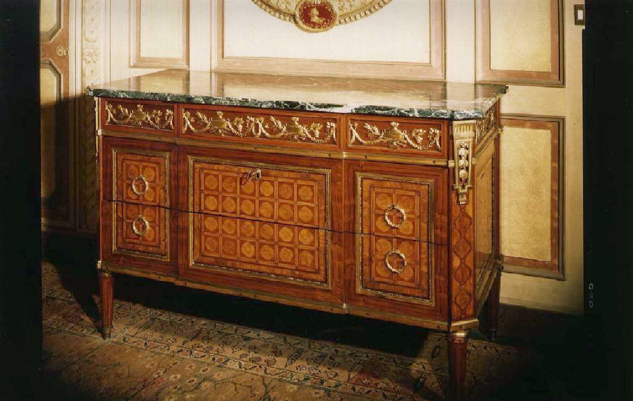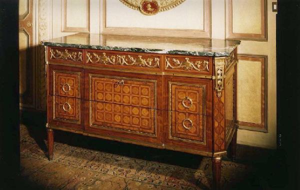 Il cassettone, in legno impiallacciato e intarsiato, è dotato di un piano\n in marmo verde con decorazioni in bronzo dorato. Il fonte è dotato di du\ne cassetti senza traversa, mentre nella fascia superiore ci sono tre cassetti mimetizzati. Opera dell'ebanista francese Jacques-Laurent Cosson (1737-1812), è stato realizzato tra il 1770 e il 1780.