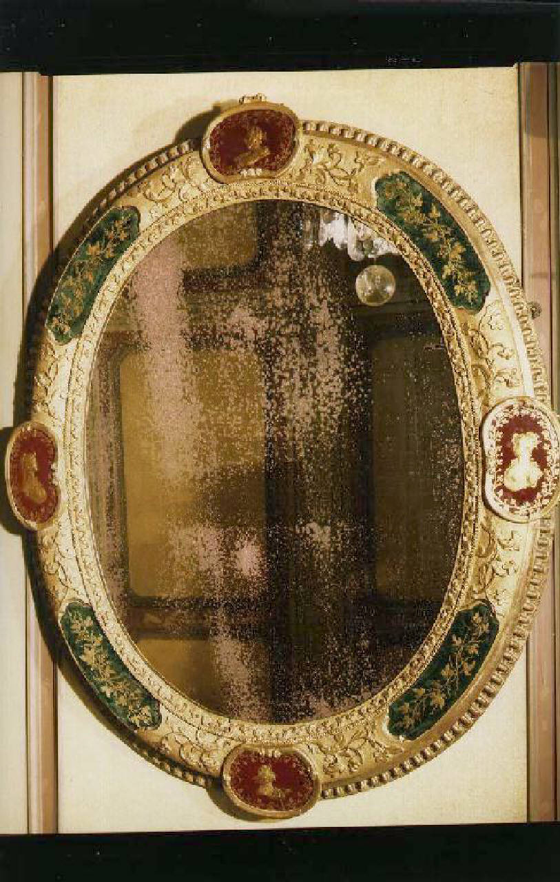 Specchiera ovale con decorazioni floreali incise sulla cornice alternate a inserti vitrei ovali blu e rossi intagliati e dorati con profili e viticci