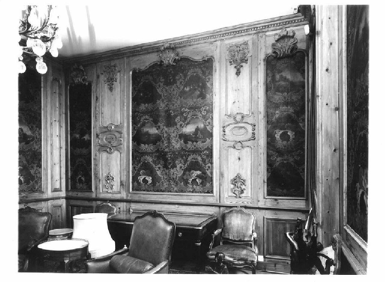 Pannelli in legno con decorazioni intagliate applicate a volute, vasi di fiori e conchiglie alternati a nove pannelli in carta dipinta con volute e scene di caccia e nature morte