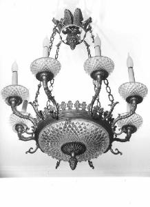 Lampadario a otto bracci intorno a piatto centrale centrato da pigna, attaccatura con piume