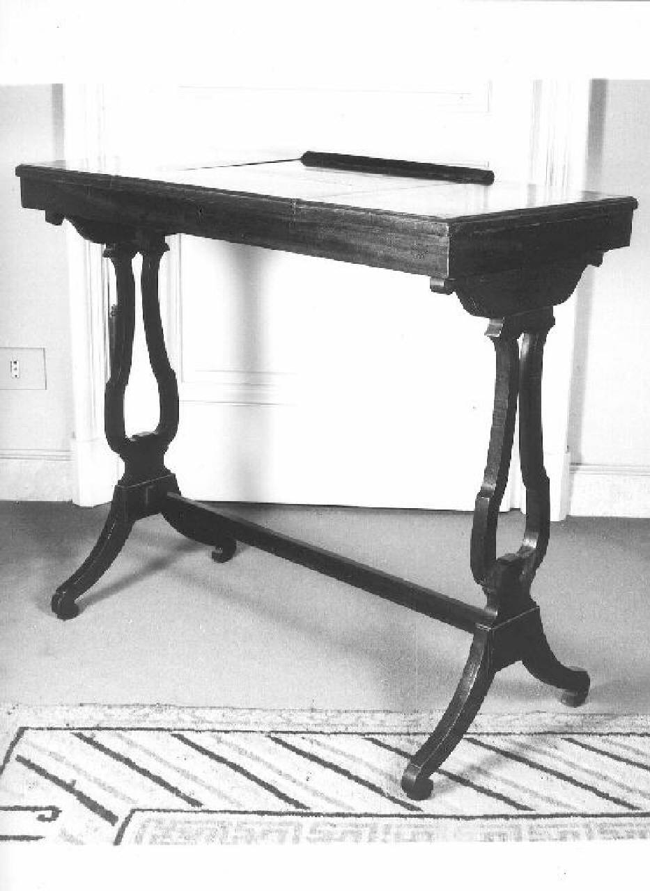Tavolo con sportelli laterali incernierati lateralmente e uno centrale dotato di specchio interno, gambe a lira con traversa e piedi a ricciolo
