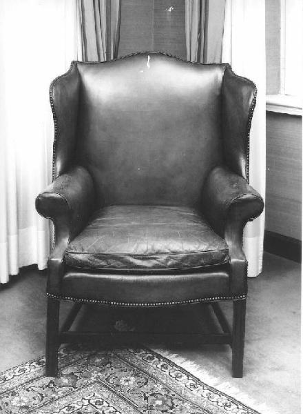 Poltrona ad ali rivestita in pelle marrone, cuscino indipendente, due traverse, gambe dritte modanate