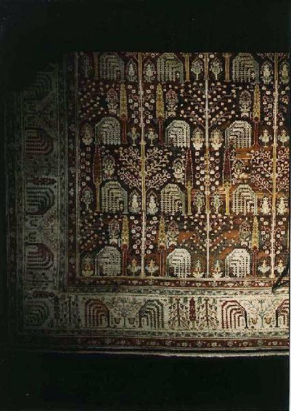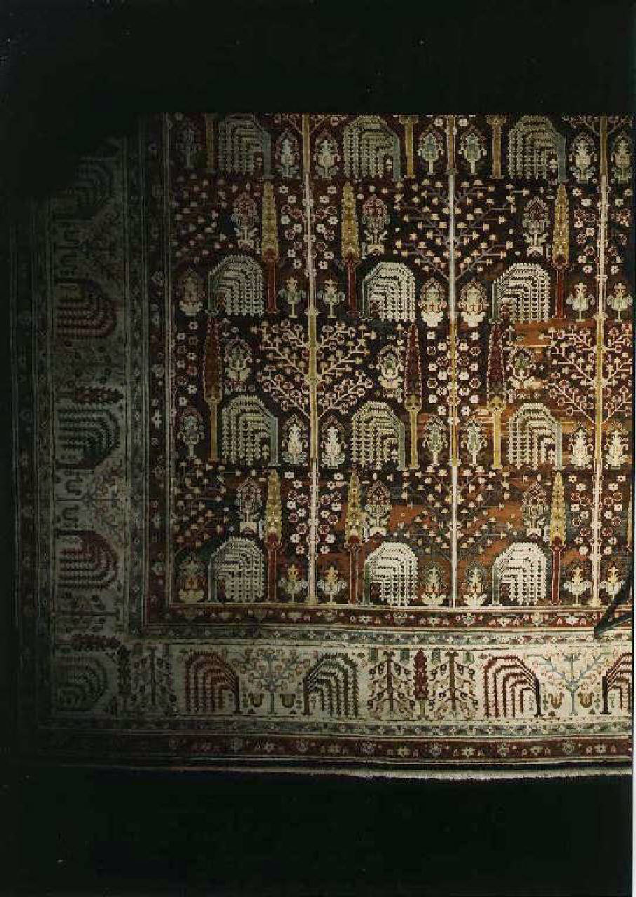 Il tappeto, in lana e cotone, è decorato a tutto campo con motivi vegetal\ni in file orizzontali, raffiguranti salici e cipressi, su un fondo rosso con riflessi blu. Di manifattura Agra (India Centro-Settentrionale), risale alla prima metà del XIX secolo.