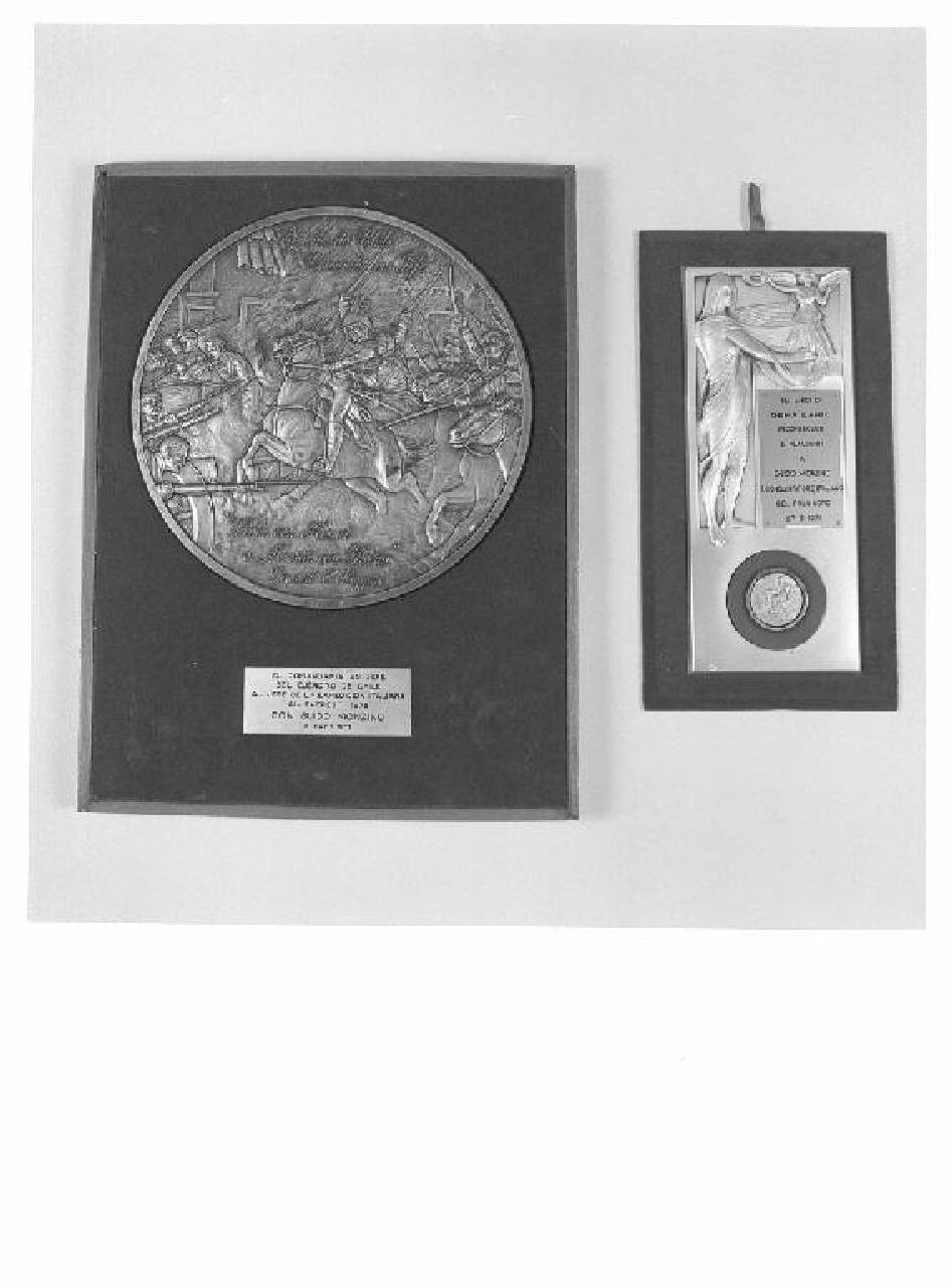 La targa è inserita in una cornice di legno ricoperta di velluto rosso. La targa è composta di tre metalli diversi e nella parte bassa è inserito un supporto circolare di plastica rossa.