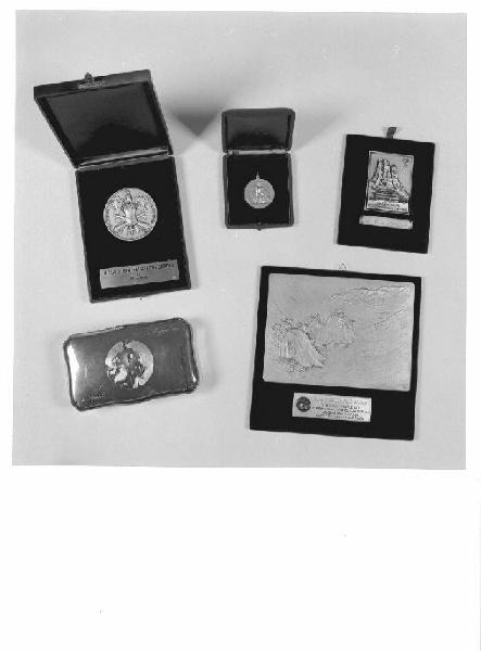 La targa è montata su una cornice ricoperta di velluto blu e inserita in un cofanetto di cartone rigido blu che si chiude con un gancio in metallo.