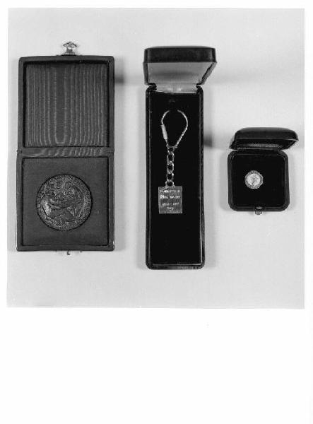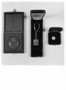 La spilla è inserita in un cofanetto di plastica di colore blu e inserita in una cornice di velluto. L'interno della chiusura del cofanetto è ricoperta di raso di colore blu.