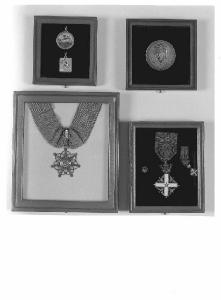 La medaglia è costituita da una stella a cinque punte su di una croce bianca all'interno di un rombo con quattro acquile e attacata ad una corona turrita. La coccarda riprende lo stesso motivo della medaglia. La spilla è costituita da una corona turrita in metallo inserita in un supporto circolare di stoffa verde a strisce oblique rosse.\nGli oggetti sono fissati con degli spilli ad una cornice di velluto bordeaux entro un cofanetto ricoperto di cuoio marrone la cui parte superiore è in plastica trasparente. Nella parte posteriore del cofanetto c'è un gancio metallico.