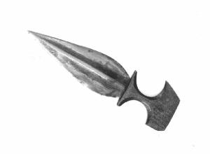 Il pugnale ha un'impugnatura in legno. La lama si allarga nella parte centrale per poi stringersi sempre più fino alla punta. Su un lato dell'impugnatura è incisa una decorazione a motivi geometrici.