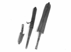 Il manico del pugnale è in legno ricoperto di pelle animale(?) di colore rosso e la lama inserita in una custodia in legno ricoperta di pelle animale(?) colorata di rosso. La custodia termina con una struttura circolare in metallo e su di un lato c'è un gancio. Su un lato della custodia si nota la cucitura della pelle che ricopre il legno. La lama si allarga nella parte finale.