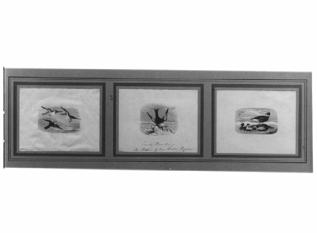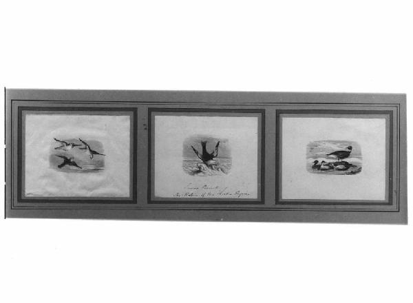 Tre incisioni inserite in una cornice in legno.