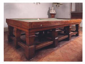 Tavolo rettangolare a dodici gambe scanalate e rastremate poggianti su basi quadrate unite da traverse liscie; ricoperto di panno verde, le sponde con imobottitura morbida e rivestite in pelle; provvisto di sei buche