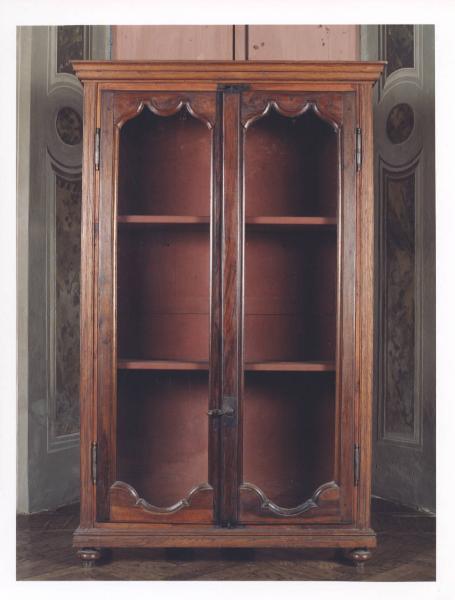 Vetrina a due ante sagomate all'estremità, tre ripiani interni, poggiante su piedi a trottola