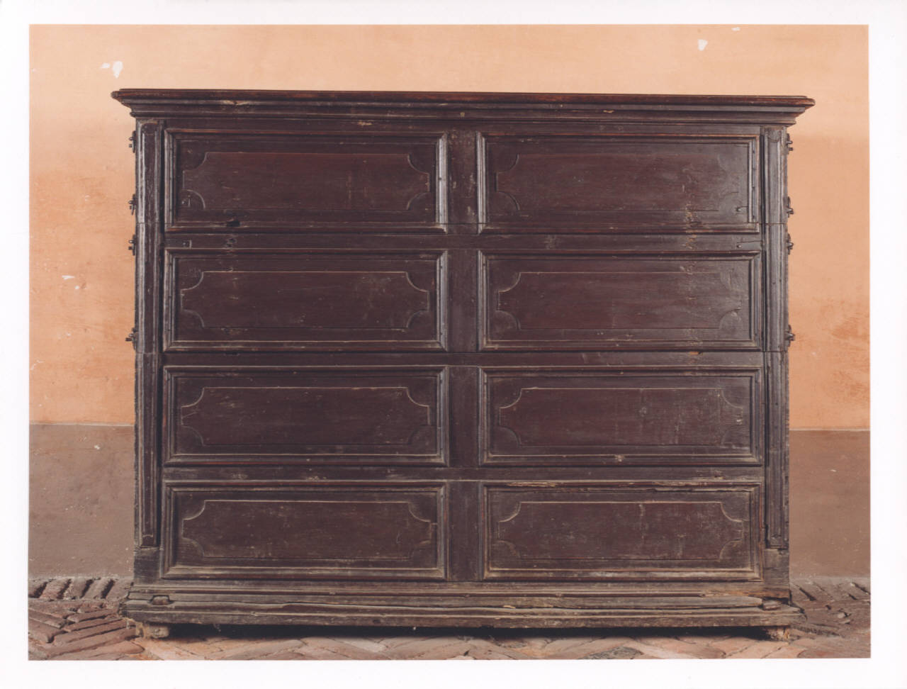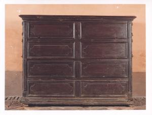 Madia con quattro finti cassetti intagliati e decorati da formelle mistilinee entro cornici centinate, piano a ribalta e apertura della parte frontale attraverso perni e ganci laterali