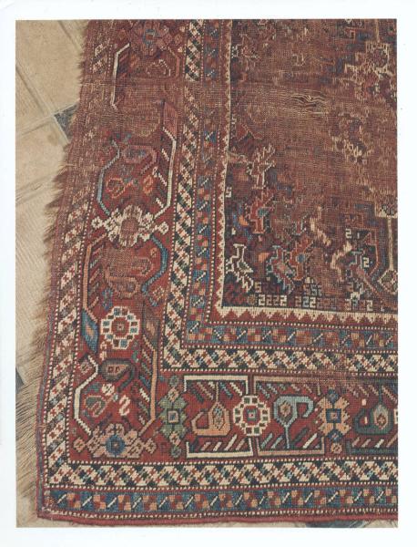 - NOTIZIE STORICO CRITICHE Numerosi gli esemplari a tre medaglioni, come il tappeto in oggetto. Si deve inoltre tenere presente che di solito questi tappeti presentano un'ottima qualità della lana ed un perfetto assorbimento delle tinture che permettono di fornire un'intensità e brillantezza del tutto particolari, dove,prevale il rosso ottenuto dalla robinia, spesso usato come colore di fondo, il blu scuro e, in quantità minore, il verde chiaro, bottiglia o azzurrato, il bianco della lana naturale, alcune volte candeggiato. Più limitato l'uso del giallo intenso o chiaro, dell'azzurro, del marrone, del nero e del beige, generalmente riscontrabili nei disegni. La bordura più esterna ha un disegno a nubi stilizzate con alternanza di fiori.