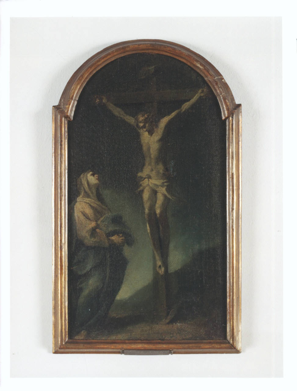Dipinto centinato ad olio su tela con Cristo crocifisso e Madonna dentro una cornice lignea dorata.