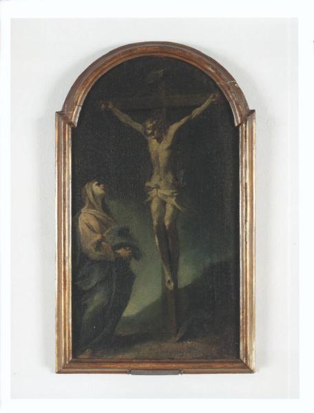- NOTIZIE STORICO CRITICHE Il dipinto, già nella collezione delle sorelle Gigina e Nedda Necchi, entra a far parte del patrimonio FAI nel 2001, in quanto parte del lascito di Villa Necchi Campiglio a Milano. La piccola opera, di carattere votivo, raffigura Cristo crocifisso con la Madonna sotto la croce. Il dialogo avviene tra la Madre e il Figlio ormai morto, col capo reclinato sul petto. L'intensità del sentimento è sottolineata anche dall'uso di tinte cupe con piccoli tocchi di luce che illuminano alcuni particolari dei due sacri protagonisti. Sebbene un cartellino sulla cornice dell'opera attribuisca il dipinto a Daniele Crespi, l'opera è stata inizialmente riferita a scuola veneziana del XVII secolo (cfr. Inventario Trinity Fine Art, 1994; Inventario Redaelli, 2002/2003). All'inizio degli anni 2000 il dipinto è stato rifoderato. Nel 2012 è stata ipotizzata l'attribuzione a Pietro Antonio Magatti.