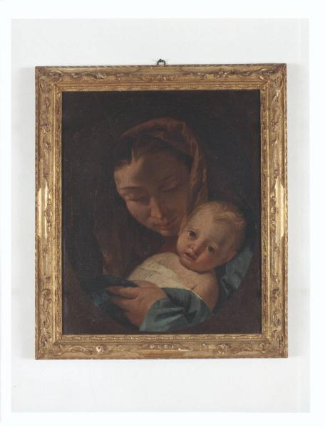 - NOTIZIE STORICO CRITICHE Il dipinto, già nella collezione delle sorelle Gigina e Nedda Necchi, entra a far parte del patrimonio FAI nel 2001, in quanto parte del lascito di Villa Necchi Campiglio a Milano. L'opera raffigura la Vergine con il capo coperto da un manto rosato, il volto abbassato verso il figlio, quasi rapito dalla contemplazione dello stesso, gli occhi timidamente abbassati. Il gioco chiaroscurale è piuttosto fondo e soltanto la parte sinistra del volto della Madonna è in luce, contrastando con il volto del bambino avvolto nelle fasce bianche e completamente illuminato, quasi a voler sottolineare, con questa differenza di luminosità, il carattere delle due figure. Il dipinto era racchiuso probabilmente in una cornice ovale, come un esame ravvicinato sembra suggerire. Attribuita a scuola veneta del XVIII secolo, l'opera è la copia di una "Madonna con Bambino" di Tiepolo conservata al Detroit Institute of Arts (inv. 29.4; https://www.dia.org/art/collection/object/madonna-and-child-63488).
