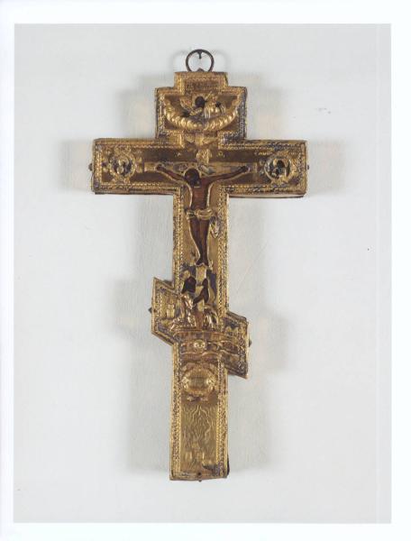 L'opera presenta al centro Cristo; ai suoi piedi Santa Maria Maddalena che abbraccia la croce mentre alle sue spalle si notano delle torri merlate; nei due tondi compaiono la Vergine e San Giovanni Evangelista in parte dipinti e in parte rivestiti dalla lamina in argento. In alto Dio Padre diviso con un cordolo di nubi in lamina argentea, così come è stata realizzata anche la colomba, simbolo dello Spirito Santo. Sui fianchi e nel retro corre una lunga iscrizione in greco.\nCrocifisso ligneo rivestito di una lamina in argento dorato finemente cesellato e punzonato.